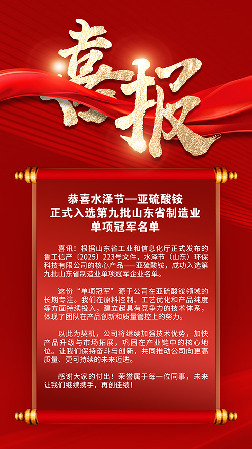 喜讯!根据山东省工业和信息化厅正式发布的鲁工信产〔2025〕223号文件,水泽节(山东)环保科技有限公司的核心产品--亚硫酸铵,成功入选第九批山东省制造业单项冠军企业名单。